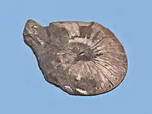 | Fossil shell of Virgatites virgatus from Russia, on display at Galerie de paléontologie et d'anatomie comparée in Paris | |
