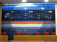 A focus of visual interest is the large (24 by 36 foot) mosaic mounted on the wall behind the judges' bench...a dramatic compound of 126 porcelain-on-steel pieces [that] represents the artist's conception of the harmony of the law and the rich tapestry of the American legal system.