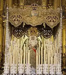 The canopy or Pallio of the Macarena filled with imperial regalia and expensive and costly textiles. A statue of Our Lady of the Pillar, patroness of Zaragoza, Spain is located in the front.