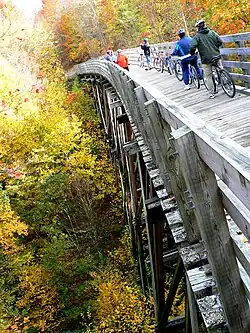 The trail accommodates hikers, cyclists and equestrians on its descent from Abingdon to Damascus, near the North Carolina state line – passing through National Forest, crossing a number of restored trestles and the Appalachian Trail.