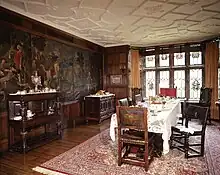 The rear hall again uses old oak high paneling and has small six by nine-inch oil portraits of Renaissance figures. Freestanding Corinthian columns in the hallway form an ornamental gateway and stained glass doors at the end enter the rear porch arcade. The dining room was furnished with oak bought later from Redbourn Manor in Hertfordshire and has an imposing Portland stone fireplace positioned midway in the room.[4] The floor is made of old re-sawn pegged oak and the Tudor rose ceiling motif is repeated.[4] In the southeast wing of the house is the Sulgrave Room, a reproduction of the great hall from the Washington family's Sulgrave Manor. The fireplace mantel is made of an oak beam, once used at the original priory.[4] Heavy oak timbers were used to construct the open beam ceiling in this room, which also features mottled plaster walls.[4]