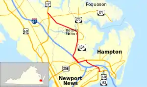 State Route 134 (SR 134) is a primary state highway in the U.S. state of Virginia. The state highway runs 11.63 miles (18.72 km) from U.S. Route 60 (US 60) and SR 143 in the independent city of Hampton north to US 17 in Tabb. SR 134 is the main connection between Hampton and southeastern York County and a major artery through Hampton, where the highway runs concurrently with US 258 and Interstate 64 (I-64).