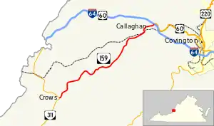 SR 159 begins at a wye intersection with SR 311 (Kanawha Trail) in the hamlet of Crows in southwestern Alleghany County. The state highway heads northeast and parallels Dunlap Creek through its valley between Peters Mountain to the east and Brushy Mountain to the west. SR 159 passes through the hamlets of Hematite and Moss Run within the valley. As the state highway approaches Callaghan, it veers away from the creek and passes under CSX's Alleghany Subdivision. SR 159 crosses Ogle Creek just before intersecting SR 600 (Midland Trail), the old alignment of US 60. The state highway crosses Dunlap Creek once more before terminating within its partial diamond interchange with I-64 and US 60, which runs concurrently with I-64 west from the interchange toward West Virginia. The roadway continues east as US 60 (Midland Trail) toward Covington.[1][2]
