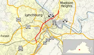 State Route 163 (SR 163) is a primary state highway in the U.S. state of Virginia. The state highway runs 6.74 miles (10.85 km) from U.S. Route 501 (US 501) and US 29 Business in Lynchburg north to US 29 Business in Madison Heights. SR 163 is the original alignment of US 29 through Lynchburg, a highway has been twice bypassed: first by the Lynchburg Expressway and later by US 29's present bypass. The state highway provides access to downtown Lynchburg and many other historic neighborhoods of the independent city.