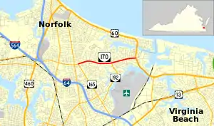 State Route 170 (SR 170) is a primary state highway in the U.S. state of Virginia. Known as Little Creek Road, the state highway runs 2.65 miles (4.26 km) from SR 165 east to U.S. Route 60 (US 60) within the independent city of Norfolk. SR 170 is the eastern part of the connection between Naval Station Norfolk and Naval Amphibious Base Little Creek.