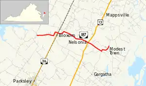 SR 187 begins at an intersection with SR 658 (Winterville Road) in the village of Guilford. The state highway heads east as two-lane undivided Guilford Road to the town of Bloxom. SR 187 veers north along Shore Main Drive, then heads east again to intersect the northern end of SR 316 (Bayside Drive) and cross an inactive railroad line. The state highway curves north again, then veers east and follows Nelsonia Road through Macedonia to Nelsonia, where the highway meets US 13 (Lankford Highway). Before entering Modest Town, SR 187 reaches SR 679 (Metompkin Road) a short distance southwest of the community. SR 187 turns left onto Metompkin Road and passes through Modest Town before the designation ends just northeast of the community. SR 679 continues north as Metompkin Road.[1][2]