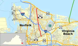 State Route 194 (SR 194) is a primary state highway in the U.S. state of Virginia. The state highway runs 5.75 miles (9.25 km) from SR 166 north to U.S. Route 60 (US 60) within the independent city of Norfolk. SR 194 is a major north–south thoroughfare in the eastern part of Norfolk.