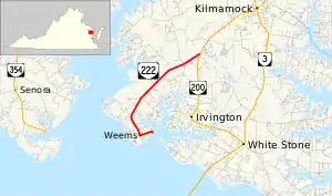 State Route 222 (SR 222) is a primary state highway in the U.S. state of Virginia. Known as Weems Road, the state highway runs 4.17 miles (6.71 km) from Weems north to SR 200 near Irvington in southern Lancaster County.