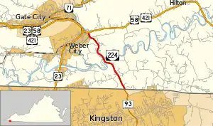 SR 224 begins at the Tennessee state line at Wadlow Gap, a wind gap in a low range of hills between Carter Valley to the north and the larger valley to the south that contains Kingsport. Wadlow Gap Road continues south toward that city as SR 93. SR 224 heads north and crosses the Carter Valley, then crosses Long Ridge before crossing the North Fork Holston River. The state highway veers west and curves back east around Pine Ridge before reaching its northern terminus at US 58 and US 421 (Hilton Road) a short distance to the east of Moccasin Gap on the eastern edge of the town of Weber City, where US 58 and US 421 intersect US 23.[1][2]