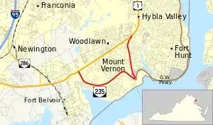State Route 235 (SR 235) is a primary state highway in the U.S. state of Virginia. The state highway runs 5.05 miles (8.13 km) between intersections with U.S. Route 1 (US 1) in Fort Belvoir and Hybla Valley. SR 235 forms a southeast loop off of US 1 through the community of Mount Vernon in southeastern Fairfax County, connecting US 1 with Mount Vernon, the plantation home of George Washington, and the southern end of the George Washington Memorial Parkway.