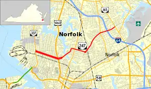 State Route 247 (SR 247) is a primary state highway in the U.S. state of Virginia. The state highway runs 5.31 miles (8.55 km) from SR 337 east to SR 165 within the independent city of Norfolk. SR 247 is a major east–west thoroughfare that connects U.S. Route 460 (US 460) and Interstate 64 (I-64) with Norfolk International Airport.