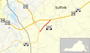 State Route 272 (SR 272) is a primary state highway in the U.S. state of Virginia. Known as South Quay Road, the state highway runs 1.24 miles (2.00 km) from SR 189 east to U.S. Route 58 (US 58) and SR 189 within the independent city of Suffolk. SR 272 is a cut-off of old alignment of SR 189.