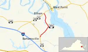 State Route 273 (SR 273) is a primary state highway in the U.S. state of Virginia. Known as Farmers Drive, the state highway runs 5.33 miles (8.58 km) from SR 30 in Barhamsville north to SR 30 and SR 33 at Eltham. SR 273 is the old alignment of SR 30 in eastern New Kent County.