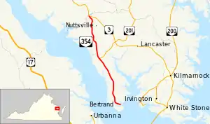 SR 354 begins at a dead end on Whitehouse Creek, an estuarine tributary of the Corrotoman River. The state highway heads west and northwest along the peninsula between the Western Branch of the Corrotoman River to the east and the Rappahannock River to the west. SR 354 passes through the hamlets of Bertrand, Senora, and Ottoman, the last the site of a free ferry across the Western Branch. North of Mollusk, the state highway meets the southern end of SR 201 (White Chapel Road). SR 354 continues through Somers, which lies between Nuttsville to the east and Belle Isle State Park to the west on the Rappahannock River. The state highway passes through Litwalton and crosses Balls Branch of Lancaster Creek before reaching its northern terminus at SR 3 (Historyland Highway). The SR 3 junction is just east of where SR 3 crosses Lancaster Creek into Richmond County.[1][2]
