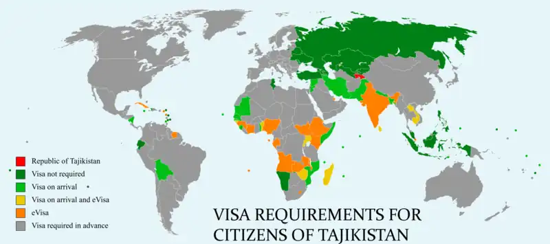 Visa requirements for Tajik citizens are administrative entry restrictions by the authorities of other states placed on citizens of Tajikistan. As of 2 July 2019, Tajik citizens had visa-free or visa on arrival access to 57 countries and territories, ranking the Tajik passport 87th in terms of travel freedom (tied with a passport from Burkina Faso) according to the Henley Passport Index.[1]