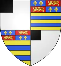 ![]() ![]() Quarterly, 1st & 4th: Argent, a canton sable (Sutton) 2nd & 3rd: Or, two bars azure, a chief quarterly azure and gules, the 1st and 4th quarters charged with two fleurs-de-lis or, and the 2nd and 3rd a lion of England (Manners) | |