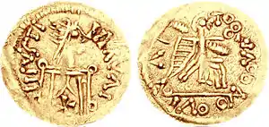 Only tremisses were minted in this period, and the purity of the gold used diminished over time.[14] The coins bear the name of the king and also the name of the mint where they were struck. Unlike Frankish or later Anglo-Saxon coins, the name of the moneyer is not given.
