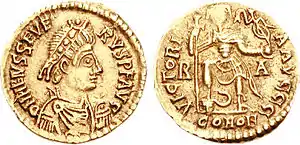 The first coins of the Visigoths, struck approximately between 420 and 440, imitate those minted in Ravenna by Honorius (393-423).[3] The most common type has an obverse type with the legend D N HONORI – VS P F AVG and the bust of the emperor facing right, wearing a diadem and armour. On the reverse the legend reads VICTORI – A AVGGG and the emperor is depicted on foot, holding a labarum with his right hand, and a globe bearing a Victory in his left hand. His left foot rests on a prostrate captive. On the side of the emperor the letters R – V indicate the mint of Ravenna, and the exergue bears the inscription COMOB.[6]