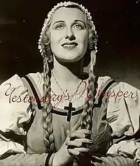 In 1935, Della Chiesa entered and won a large contest sponsored by WBBM,[5] the Chicago affiliate of the CBS network. Her prize was a $100 a week contract to appear on thirteen weekly radio programs. These appearances led to an invitation from Paul Longone, the impresario of the Chicago Opera, to audition. Della Chiesa obtained an engagement with the company for three years. Her Chicago debut occurred on November 15, 1936, as Mimi in La Bohème. She also appeared with the company as Adina, (L’Elisir D’Amore), Micaela (Carmen), Marguerite (Faust) and Eudoxie (La Juive).[6] In 1943, she twice sang under the baton of the composer Italo Montemezzi in his own works - L'Amore dei tre re (Fiora) [7] and, on October 9, in the first performance of L’Incantesimo (Giselda)[8] with the NBC Symphony. She sang with the San Francisco Opera in 1944 (Falstaff - Alice; Faust - Marguerite) and in 1945 (Boris Godunov - Marina (in Italian with Ezio Pinza); Cavalleria Rusticana - Santuzza; Don Giovanni - Donna Elvira; La Bohème - Mimi).[9] Della Chiesa also appeared with the St. Louis Opera, the Cincinnati Opera Company and the Havana International Opera. She appeared with the New York City Opera in 1947 as Maddalena in Andrea Chenier.