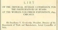 Kovalevsky also headed the commissions for preparing Russian exhibits at the 1893 World's Columbian Exposition in Chicago and the 1900 World's Fair in Paris. By Kovalevsky's personal initiatives, 1893 saw the beginning of the publication of the "Trade and Industry Gazette" (Russian: Торгово-промышленная газет). In 1896, he developed a project on the position of Russia's commercial schools.[7] He also contributed to the conclusion of trade agreements with Germany and other countries.[8] With Kovalevsky's active involvement, the 1896 All-Russia industrial and art exhibition took place in Nizhniy Novgorod.[9] Later, in 1898, he was involved in the development of a new law on state-industrial taxes. From 1899 to 1901, Kovalevsky was chairman of the Special conference on the preparation of legislation on the establishment of industrial enterprises.