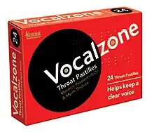 Vocalzone Throat Pastilles is a brand of throat pastille, or throat lozenge, used to help keep a speaking or singing voice clear during public performance and singing. The company was founded in 1912 by William Lloyd, who adapted a medicine he had created for the tenor Enrico Caruso into a pastille form.[1] After Lloyd’s death in 1948, Vocalzone was sold to Ernest Jackson in 1955 before later being acquired by Kestrel HealthCare Limited (now Kestrel Medical Limited) in 1993.[2]