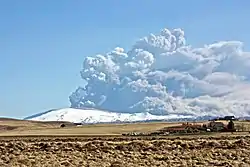 Volcanic ash consists of small tephra, which are bits of pulverized rock and glass less than 2 millimetres (0.079 in) in diameter created by volcanic eruptions.[10] The ash enters the atmosphere from the force of the eruption and convection currents from the heated air, and is then carried away from the volcano by winds. The ash with the smallest size can remain in the atmosphere for a considerable period of time, and can drift away from the eruption point. The ash cloud can be dangerous to aviation if it reaches the heights of aircraft flight paths.