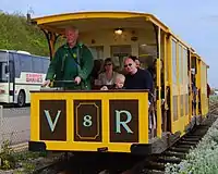 8 (2nd) Southend Pier 40 seat open Falcon Works, Loughborough 1898 (Into VER service 1950) Two 140 Volt motors. No longer on the railway[12] Purchased from Southend Pier Railway around 1948. Operated on VER until the 1990s when it was decided to retire the aged Southend cars. Static display at Southend Pier Museum.