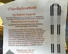 Volksgenosse was formalised in point 4 of the Nazi Party's 25-point Program in 1920 as a racial ideological term: "Only a Volksgenosse can be a citizen. Volksgenossen are only those of German blood, regardless of denomination. No Jew can therefore be a Volksgenosse".[3][4]