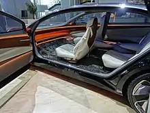 The Vizzion Concept's design was aimed to eliminate any seams or obstructions for passengers. It features rear-opening doors and windows that lie flush with the body-work of the car, thus giving the car a futuristic look.[1] The vehicle also features several LED strips that surround the car, highlighting the front grille, the door handles, rear fenders and the sides. The lights on the car start pulsating to let the user know that the car has detected one of its passengers' faces using integrated sensors.[1] The interior features only two analog dials: they are multi-functional, but are primarily for adjusting the stereo. The majority of car functions are controlled through hand gestures in the heads-up display and voice controls. The car features no steering wheel or any dashboard, as the car is level 5 autonomous.[1]