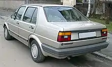 The Volkswagen Jetta (A2) is a compact car, the second generation of the Volkswagen Jetta and the successor to the Volkswagen Jetta (A1). The Mark 2 series is the longest running Jetta so far. Introduced to Europe in early 1984 and to North America in 1985, the second generation Jetta proved to be a sales success for Volkswagen. The car secured the title of best-selling European car in North America, Farmer's Journal COTY 1991 and outsold the similar Golf by two-to-one in that market.[5] Based on the all new second generation Golf platform, the car was larger, heavier, and could seat five people instead of four as in the Mark 1. Exterior dimensions increased in all directions. Overall length was up by 100 mm (3.9 in), the wheelbase grew 66 mm (2.6 in), and the width went up 53 mm (2.1 in). The suspension setup was basically unchanged from the first generation, although refined slightly, for example by the inclusion of a separate subframe for mounting the front control arms to help noise isolation, as well as improved rubber mountings for all components. Aerodynamics improved considerably, with a drag coefficient of 0.36.[6] With a 470-litre (16.6 ft3) luggage compartment, the trunk had grown nearly as large as some full-sized American sedans.[7] Interior room was also increased 14%, which changed the EPA class from sub-compact to compact.