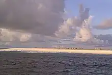 Located at 5°38′30″S 155°52′40″W / 5.64167°S 155.87778°W, just east from the geographic center of the Pacific Ocean (4°58′S 158°45′W / 4.97°S 158.75°W),[1] and measuring 8.9 kilometres (5.5 miles) east-to-west and 3.5 kilometres (2.2 miles) north-to-south, Starbuck Island has a land area of 1,620 hectares (4,003 acres).[2] It is a low, dry, coral limestone island with a steep beach backed by a 6–8-metre-high (20–26 ft) bank composed of large coral fragments. Several hypersaline lagoons form on the island's eastern side. These occasionally dry up, and are said to be dangerous to approach: one worker during the island's guano-mining days sank up to his neck in salty mud before being rescued.[3]