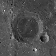 The outer edge of this crater is only slightly worn, and the edge is still well-defined with only a few tiny craterlets lying along the southwestern rim. A small crater is attached to the exterior edge of the rim to the southeast. The inner wall has a shelf or terrace along the northern and western sides. The dark interior floor has been resurfaced by basaltic lava, and it has the same low albedo as the lunar mare to the east.