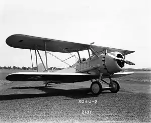 The Vought XO4U-1, BuNo A-8641,[3][4] was built in 1931, and was Vought's first airplane with a deep monocoque two-place fuselage,[5] and had a metal and fabric-covered metal wing structure.[6] Both sets of wings joined the fuselage ahead of the pair of cockpits with the pilot seated in a cut out on the trailing edge of the shoulder-mounted slightly-swept upper wing. Photos show the airframe in the factory, fitted with teardrop-shaped wheel pants, but exterior pictures taken during its brief existence do not show these installed. Powered by a 500 hp (370 kW) Pratt & Whitney R-1340D Wasp 9-cylinder air-cooled radial engine driving a two-bladed fixed-pitch propeller. Although designed to serve either as a landplane or on floats, floats had not been fitted before the prototype was destroyed.