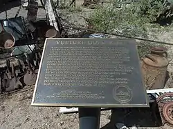 The Vulture Mine was a gold mine and settlement in Maricopa County, Arizona, United States. The mine began in 1863 and became the most productive gold mine in Arizona history. From 1863 to 1942 A.D., the mine produced 340,000 ounces (9,638.8 kgs) of gold and 260,000 ounces (7,370.9 kgs) of silver.[1] Historically, the mine attracted more than 5,000 people to the area, and is credited with founding the town of Wickenburg, Arizona.[2] The town that served the mine was known as Vulture City.