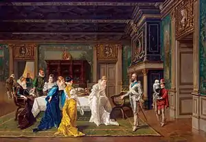 In 1863, after the start of the January Uprising, he became part of the Great Emigration and moved to Paris,[2] taking French citizenship. His most popular works there were miniatures, largely consisting of costume scenes from the 16th and 17th centuries; especially scenes from the court of King Henry II.[1]