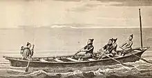 The expedition set out from Copenhagen in the brig Hvalfisken, but - once arrived in Greenland - used umiaks able to navigate in the waters between the coast and the sea ice of southeastern Greenland. In 1829, the expedition reached Dannebrog Island (65° 18' N), where it was stopped by ice.[1] They wintered at Nugarlik (63° 22' N) and returned to the settlements on the west coast of Greenland in 1830.[2] Two naturalists participated - the geologist Christian Pingel and the botanist Jens Vahl. Graah published an account of the exploration.[3]
