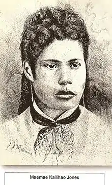 Soon after leaving the legislature, Jones married Ma'ema'e Kailiha'o Meheiwa.[2] The fifteen-year old bride descended from a noble Hawaiian family whose members included Kana'ina-nui, the High Chief who killed Captain Cook in 1779, and Moana-wahine, the ranking High Priestess of Hawai'i Island in the mid 1700s. The union produced sons Bennington, Ulysses and Elias and daughters Aletheia and Minerva before her death in 1881, at age 28, from a smallpox epidemic in Honolulu that eventually killed 287 people, most of them native Hawaiians.[2]