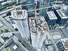 In September 2016, the city government approved a revised master-use permit for the project, which would comprise two 45-story towers with 1,050 total residential units above a retail podium and 736 parking stalls in an underground garage.[15] The permit was later modified to add four stories of residential units with a $10 million fee paid into the city's mandatory housing affordability fund.[16] Construction began in May 2018 under general contractor Graham Construction.[17] Graham and Westbank were later accused by subcontractors of failure to pay for labor or supplies; the dispute, along with the COVID-19 pandemic and a regional concrete workers strike, contributed to delays for the project.[18] Graham stepped down from the project in late 2022 and filed a $50.1 million lien against Westbank.[19][20] Icon West Construction replaced Graham as the main contractor, with construction managed by JTM Construction beginning in early 2023.[20][21] The project is planned to be completed in early 2024, three years later than originally expected.[20]