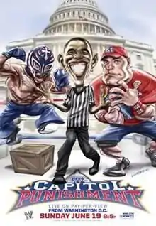 As WWE's June 2011 pay-per-view (PPV) event, which featured wrestlers from the Raw and SmackDown brands, Capitol Punishment replaced the 2010 Fatal 4-Way themed event. Promotion towards for Capitol Punishment was centered around the setting for the PPV, that being the United States capital, Washington, D.C., held at the city's Verizon Center on June 19, 2011.[3][4] WWE produced a video to promote the event using actual press footage of President Barack Obama spliced and edited with footage that WWE recorded using actors. The video was intended to show Obama answering questions about Capitol Punishment in a press conference.[5] First airing on May 22 at Over the Limit, WWE received criticism for the video. To avoid legal complications with the U.S. government, WWE added a disclaimer at the start of the video for future airings. This included spelling out their acronym as "World Wrestling Entertainment",[6] a name they ceased using earlier in the year, in which "WWE" became an orphaned initialism.[7]