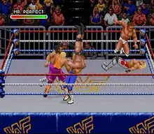 WWF Royal Rumble is a professional wrestling video game released in 1993 for the Super NES and Sega Genesis.[1] Like its predecessor, WWF Super WrestleMania, it is based on the World Wrestling Federation (WWF). It features a variety of match types, including the newly added Royal Rumble match. The game's roster consists of wrestlers who were top stars in the WWF at the time, and each version of the game has five exclusive playable characters.