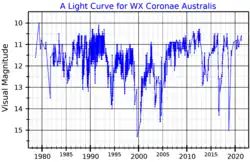 WX Coronae Australis was first reported to be variable in 1928 after it was detected on two different photographic plates at magnitudes 12.2 and 16.0. It was catalogued as HV (Harvard Variable) 4119. The type of variability was not known at the time,[9] but in 1936 its spectrum was measured as R5 and it was tentatively classified as an R CrB star.[10] By 1996 it had been observed to fade 13 times at an average interval of 2,000 days.[11]