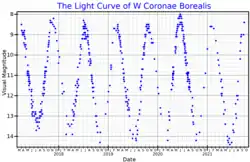 W Coronae Borealis (W CrB) is a Mira-type long period variable star in the constellation Corona Borealis. Its apparent magnitude varies between 7.8 and 14.3 over a period of 238 days.[5]