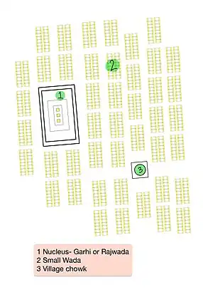 Rajwada or Palace wada houses were also the central focus of the town but with the absence of bastions and ramparts. Examples are the Bhor Rajwada, with a single courtyard, and the Satara Rajwada, with two courtyards.[1]