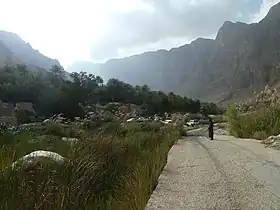 Wadi Tiwi is a canyon, 40km north of Sur in the Ash Sharqiyah Region of Oman. Dramatically situated where the Hajar Mountains reach the sea at Tiwi and enclosed by steep canyon walls, Wadi Tiwi has been continuously inhabited for at least a thousand years..[1] Although the region is desert, water drains from the mountain plateau to the north-west[2] and flows in the upper part of the wadi throughout the year, even in times of drought[3] and there are many small pools. Falaj irrigation channels have been skilfully constructed throughout the canyon resulting in lush green vegetation, date palms, terraced farms and tall grasses in the wadi stream.