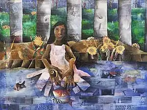 Wading in the Water is a 2007 mixed media collage by artist India Cruse-Griffin, which depicts a young woman in a pink dress in front of a tree-lined bank, waist deep in a body of water, reaching down to grab a fish. The work, which measures 37.25" x 49.25", framed, is made from collaged paper gathered from magazines, upon which Cruse-Griffin then paints, often allowing the underlying magazine paper to show through.[1][2] While her subjects are often clear and straightforward, this collage technique serves as a reminder of the accumulation of lived experience.[1][2]