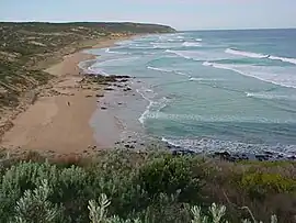 Waitpinga's coastline includes the following beaches popular for activities such as fishing and surfing – Coolawang, King Head, Parsons Beach and Waitpinga.[9] Waitpinga Beach is a popular surfing and fishing beach, good for salmon and mullet and characterized by its reddish sand. It is an exposed beach that has a consistent surf and the best surfing this close to Adelaide. It is also one of the most dangerous beaches for surfers or swimmers without experience in rough conditions. Swimmers can easily become trapped in rips and rough seas and there is no life saving service at this beach.[10] There are rough waves, powerful rips and sharks who come to feed on the salmon and mullet.