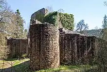 The Ruins of Waldeck, a spur castle, are located above the river Nagold near the town of Calw, Germany. They appear to be dated from the 12th century, but their exact origin is not well documented. The ruins are within the Black Forest, and the forest has partly covered the site, but there is still a well defined structure, the inside of which can be accessed by foot.