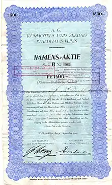The hotel was founded in 1877 as the "Hotel Waldhaus" at a time when the tourism potential of the Swiss Alps was leading to rapid growth in the sector. In 2008, following a major building programme, the Hotel Waldhaus was rebranded as the "Waldhaus Flims Mountain Resort & Spa".[1] In 2015 the business was forced by heavy indebtedness into bankruptcy and 900 shareholders lost their investment, although confidence was expressed that following financial restructuring, likely to include the sale to second home-buyers of holiday apartments included in what had by this time become a major hotel complex, the hotel would survive.[2]