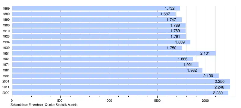In 2001 the community had 2254 inhabitants according to the census, in 2019 a little less: 2194. The population development since the 1st VZ 1869 (1732 Ew. Then, since then the population has been slowly increasing) and other socio-economic parameters for the community can be found in the.[5] The Statistics.at sample census in 2006 revealed 1104 persons in employment (employment rate of 51.3%); after the position in the job only 14% in agriculture and forestry, 25.7% in the production of goods.[6] In 2017 the number of people employed in agriculture and forestry decreased to 8.2% (= 100 people) [7]