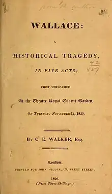 Wallace is an 1820 historical tragedy by the British writer Charles Edward Walker. It portrays the Scottish leader William Wallace and the events surrounding his capture and execution, due to the betrayal of John de Menteith. It premiered at the Theatre Royal, Covent Garden in London on 14 November 1820.[1] It starred William Macready as Wallace, Charles Kemble as Douglas, Daniel Egerton as Comyn, William Abbot as Montieth, Thomas Comer as Kierly, William Chapman as Clare, Earl of Gloster, Charles Connor as Lord de Clifford and Margaret Agnes Bunn as Helen. It was performed sixteen times.[2] The critic John Waldie, who saw the play in Newcastle four months after its London premiere, compared it to Richard Brinsley Sheridan's 1799 hit Pizarro.[3]